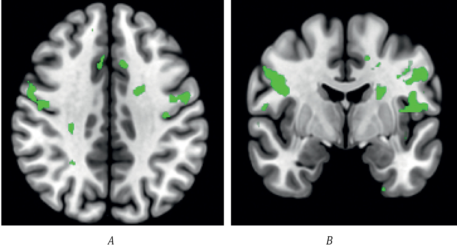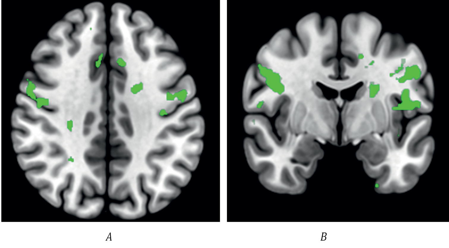 Рис. 1. Результаты внутригруппового сравнения активации мозга при выполнении когнитивной парадигмы до и после лечения.