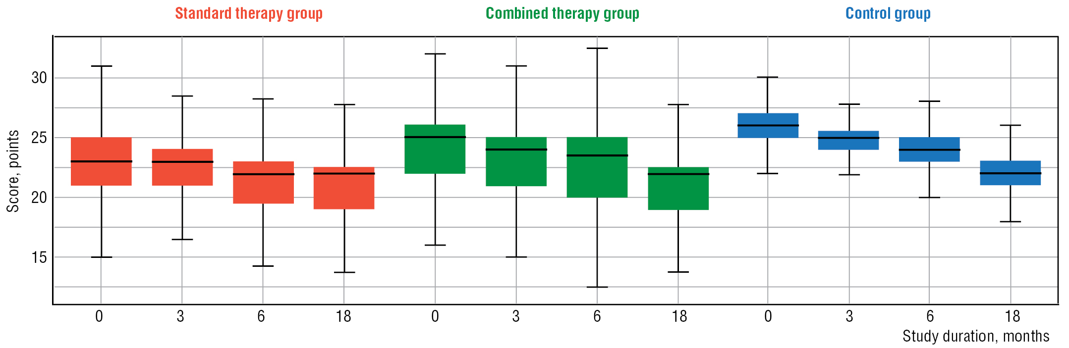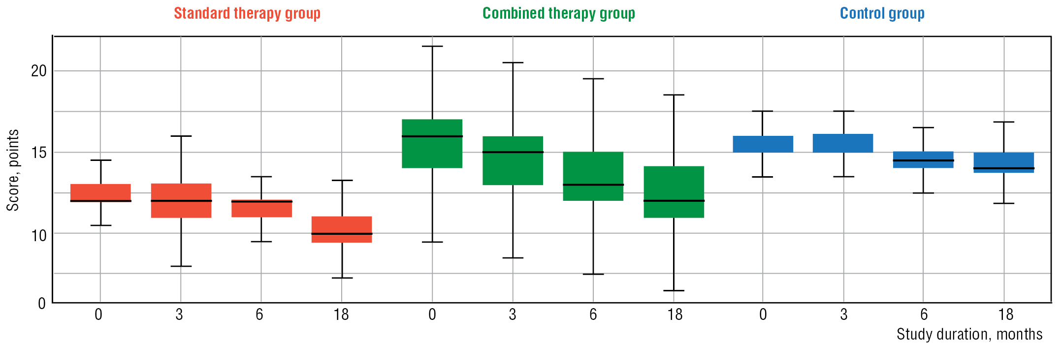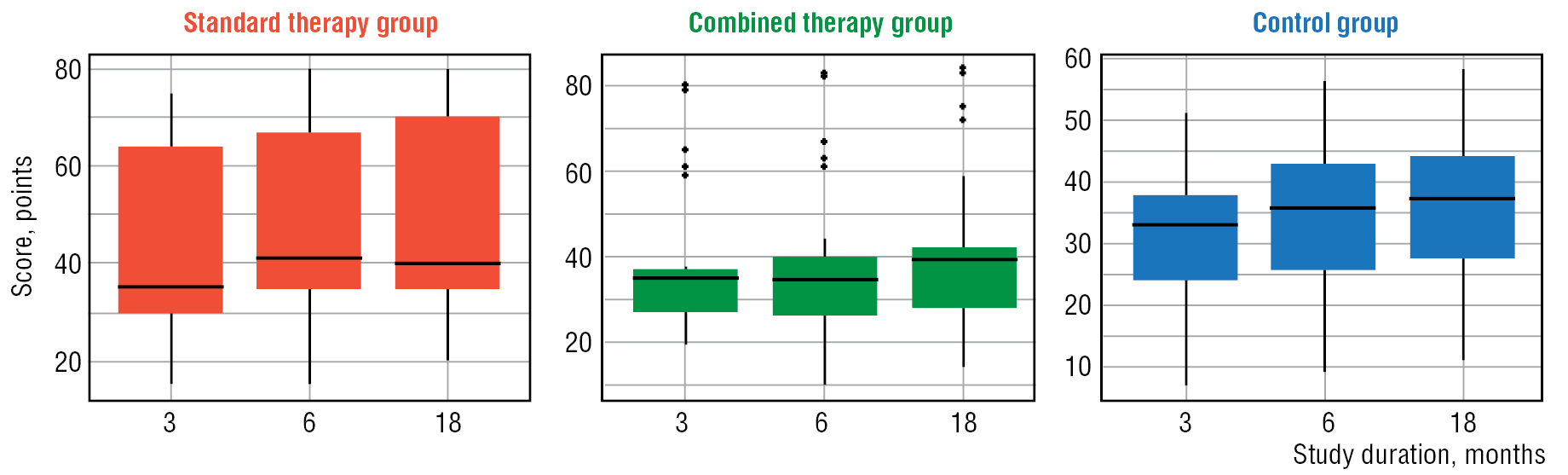 In the combined therapy and standard therapy subgroups, IQCODE scores (93 [86.0; 95.0] and 93 [90.0; 100.0], respectively) and DRS scores 14 [13; 14] and 13 [12; 14], respectively) were similar (p > 0.05). At the same time, the duration of delirium in the combined therapy subgroup was less than that in the standard therapy subgroup: 7 [4; 9] and 8 [5; 12] days, respectively (p = 0.015).