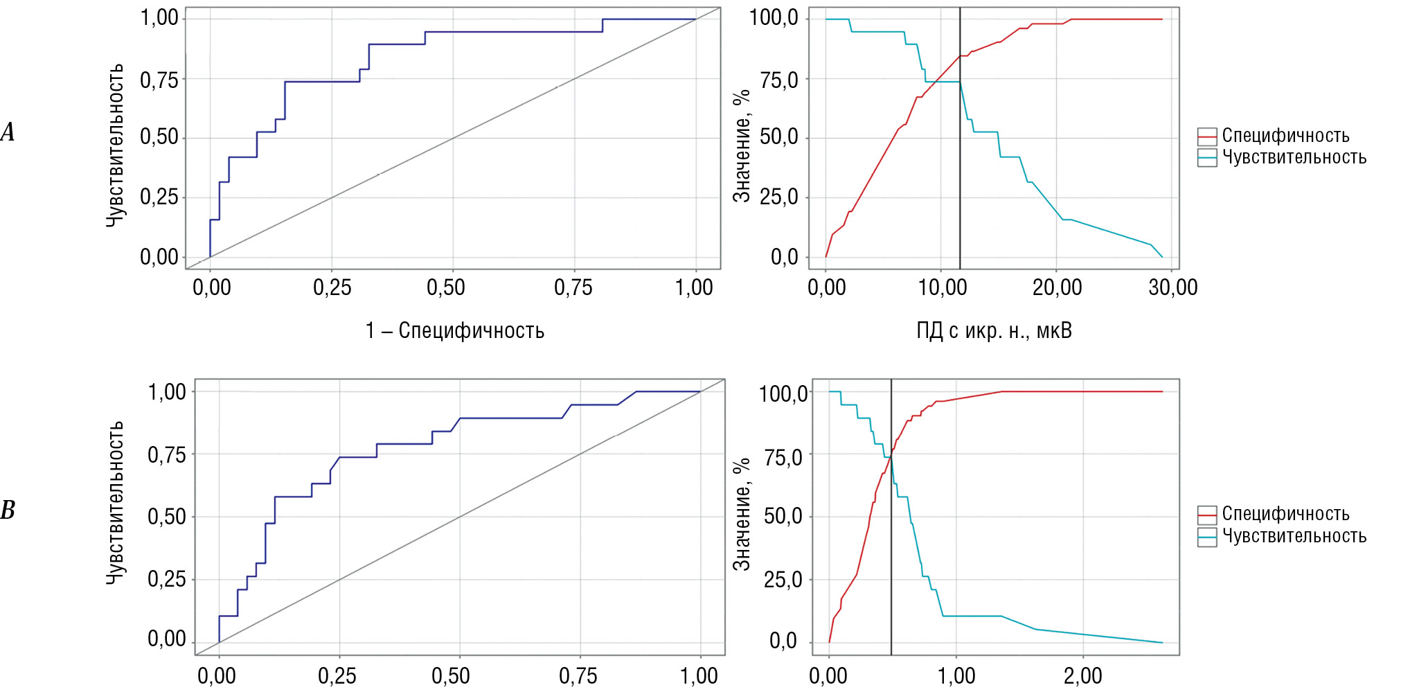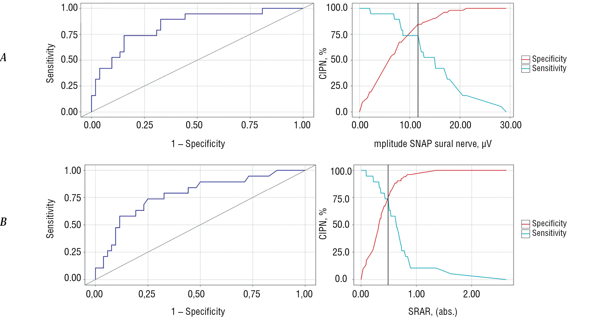 2. Fig. 1. ROC curve, model specificity and sensitivity, characterizing correlation between CIPN and аmplitude SNAP sural nerve (А) and SRAR (В).
