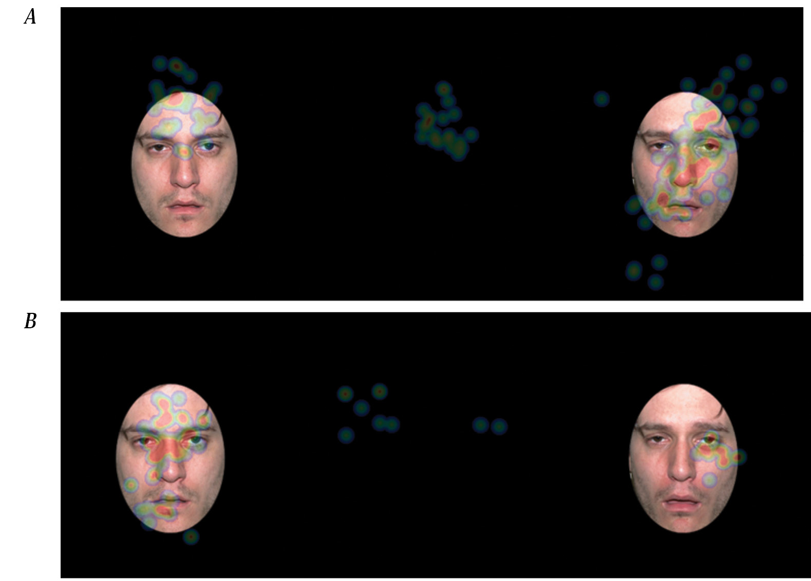 A — patient V. with ALS and clinically significant depression exhibited longer visual fixation on sad faces compared to neutral ones; B — patient N. with ALS without depression showed longer fixation on neutral faces than sad ones.