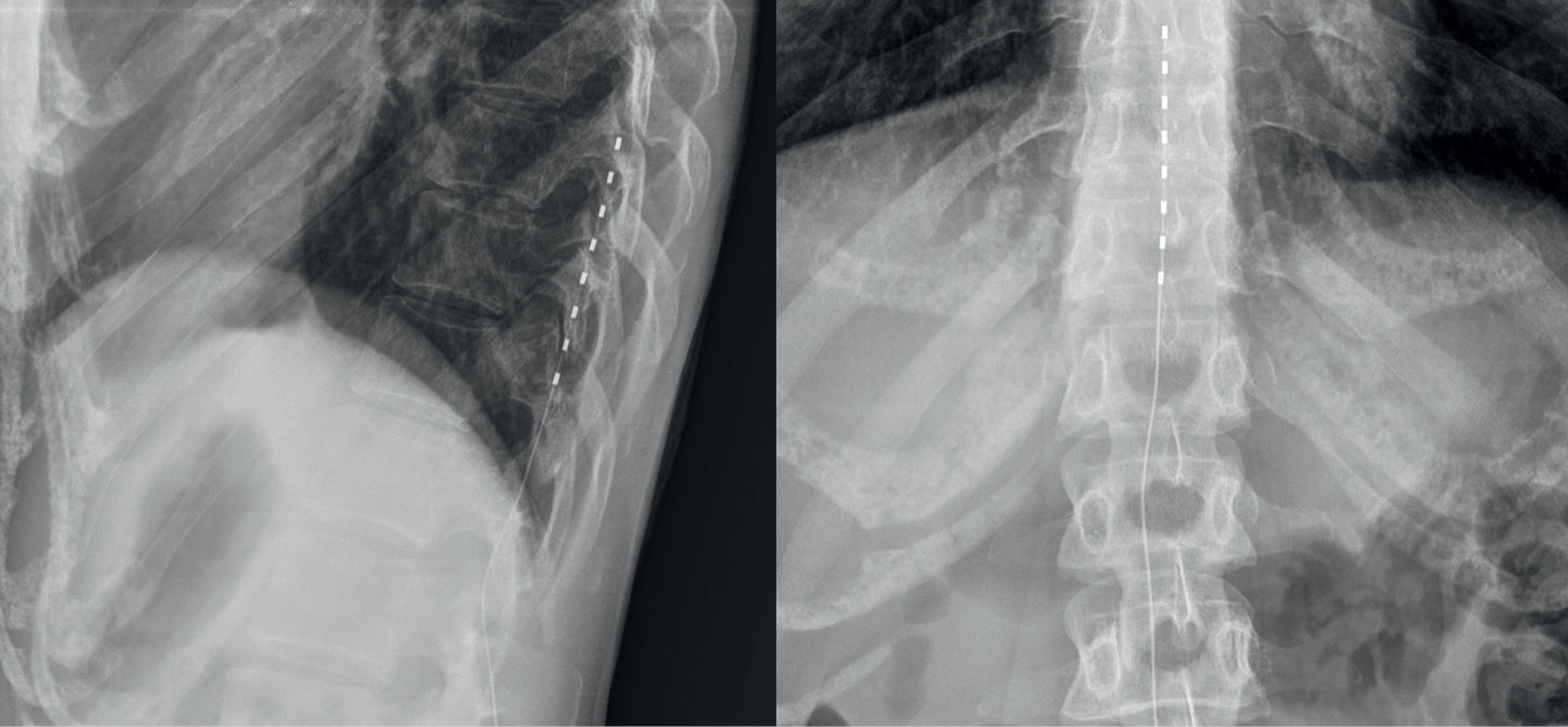 Fig. 1. Radiographic image of the implanted electrode in the posterior epidural space at the T10–T12 vertebral levels.