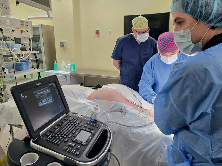 Fig. 2. Intraoperative photograph. Ultrasound-guided electrode implantation on the sural nerve (n. suralis).
