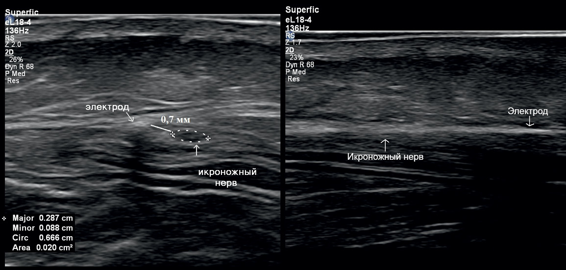 Left: transverse scan. The electrode runs along the trunk of the sural nerve (n. suralis) at a distance of less than 1 mm from it. Right: longitudinal scan. Aligning the electrode and n. suralis in the same plane is extremely challenging due to their spatial relationship, but the electrode shadow and epineurium of n. suralis can be visualized.