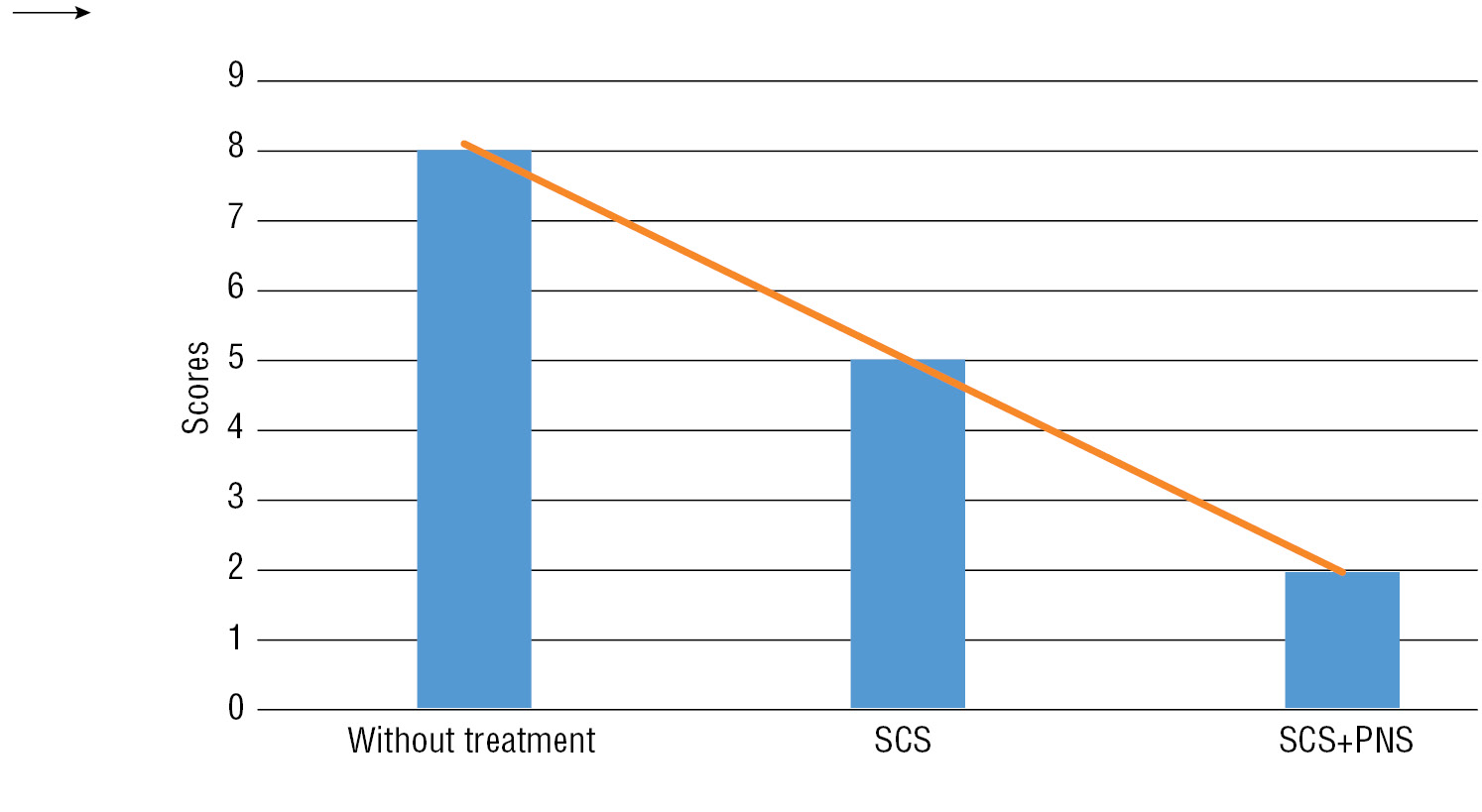 The presented clinical case demonstrates the potential of combined neuromodulation in managing complex pain syndromes. According to randomized controlled trials, PNS monotherapy achieves ≥ 50% pain reduction in 38% of patients with posttraumatic neuropathy [6], while a systematic review highlights variability in efficacy (38–78%) depending on injury etiology and location [7]. SCS provides analgesic effects in 50–70% of patients [6, 8]. Several clinical cases describe combined PNS and SCS use with superior analgesic outcomes compared to either modality alone [9–12].