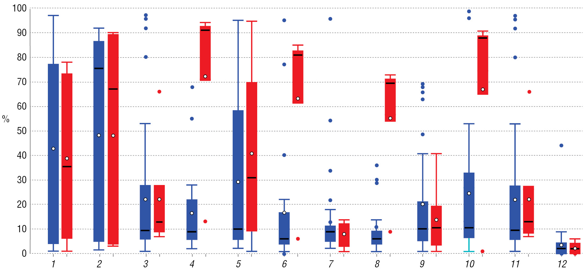 1: CD25+CD3+ at baseline; 2: CD25+CD3+ at month 6; 3: CD95+CD3 baseline; 4: CD95+CD3 at month 6; 5: CD40+CD19 at baseline; 6: CD40+CD19 at month 6; 7: CD5+CD19+ at baseline; 8: CD5+CD19+ at month 6; 9: CD38+CD19 at baseline; 10: CD38+CD19 at month 6; 11: CD95+CD19+ at baseline; 12: CD95+CD19+ at 6 months. Blue bars: patients with no exacerbation. Red bars: patients who experienced an exacerbation after the first dose of therapy.