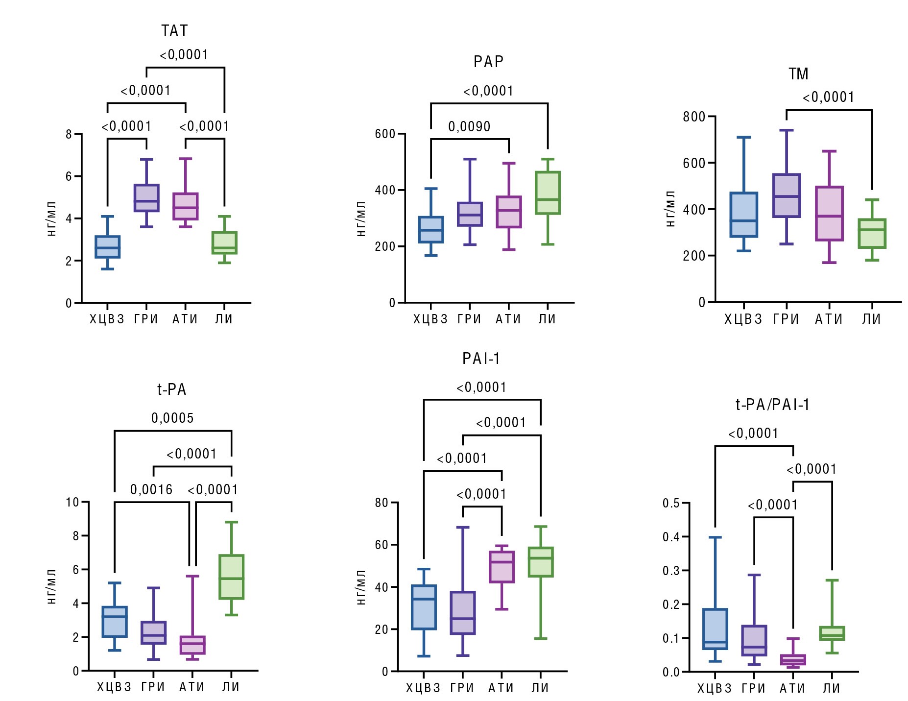 Образцы крови для лабораторных исследований были получены при кубитальной венепункции в утренние часы натощак с использованием вакуумных систем и пробирок с 3,2% цитратом натрия (цитратная плазма) и с активатором свёртывания и гелем (сыворотка). Получение, транспортировка, хранение образцов и другие условия преаналитического этапа выполнены в соответствии с Национальным стандартом Российской Федерации. Определение t-PA, PAI-1, TAT и PAP в сыворотке/плазме крови проводили в дублях иммуноферментным методом (ELISA) сэндвич-типа с использованием наборов реагентов «Technoclone» и «Cloud Clone Corparation» на плашечных ридерах «Victor 2» («Perken Elmer») и/или «Реал-Бест».