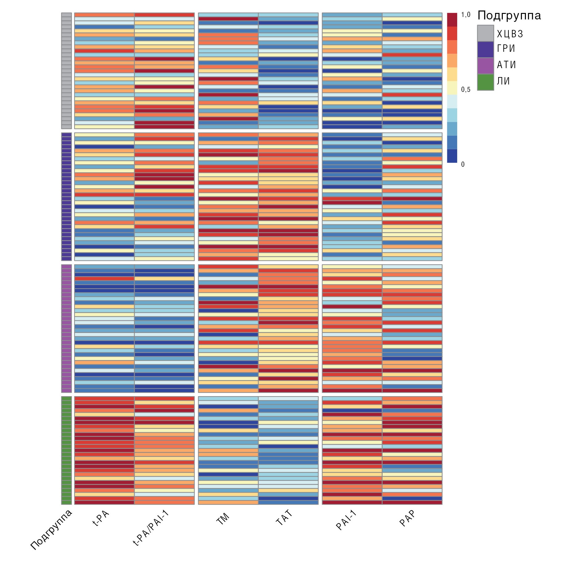 Рис. 2. Тепловая карта относительного уровня исследованных биомаркеров в зависимости от подгруппы.