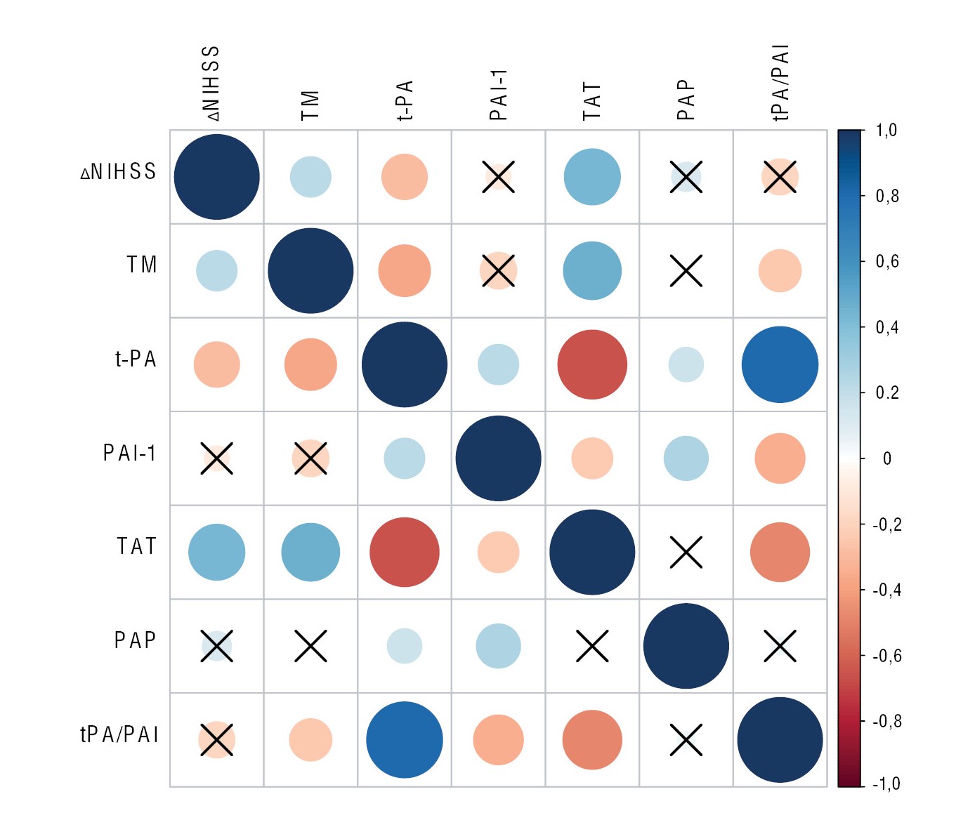 При корреляционном анализе (рис. 3) обращают на себя внимание разнонаправленные ассоциации биомаркеров друг с другом: так, повышение уровня ТАТ сопровождается уменьшением амплитуды положительной динамики по шкале NIHSS (ΔNIHSS) и снижением tPA и одновременно — положительно коррелирует с концентрацией ТМ.