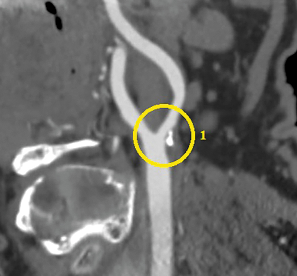 Рис. 1. Мультиспиральная компьютерная томография с ангиографией брахиоцефальных артерий: 1 — 80% стеноз левой ВСА. / Fig. 1. Multispiral computed tomography and brachiocephalic angiography: 1 — 80% left ICA stenosis.