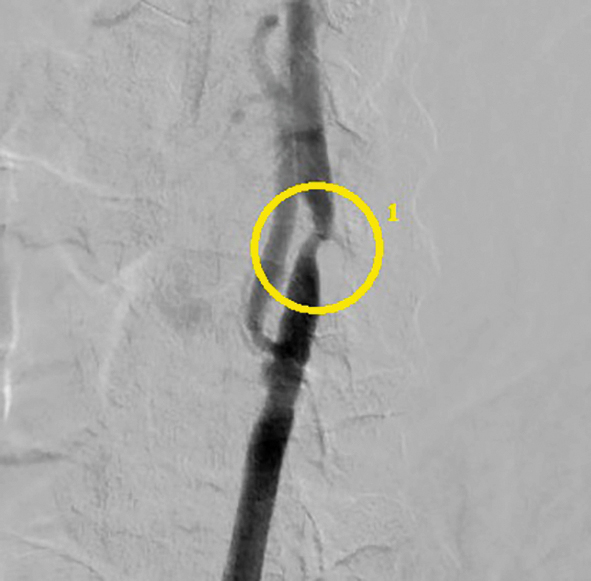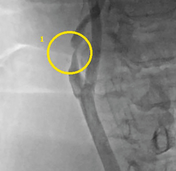 Рис. 3. Ангиография правой ВСА: 1 — 97% стеноз. / Fig. 3. Right ICA angiography — 97% restenosis.