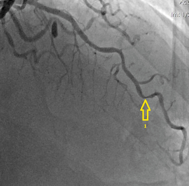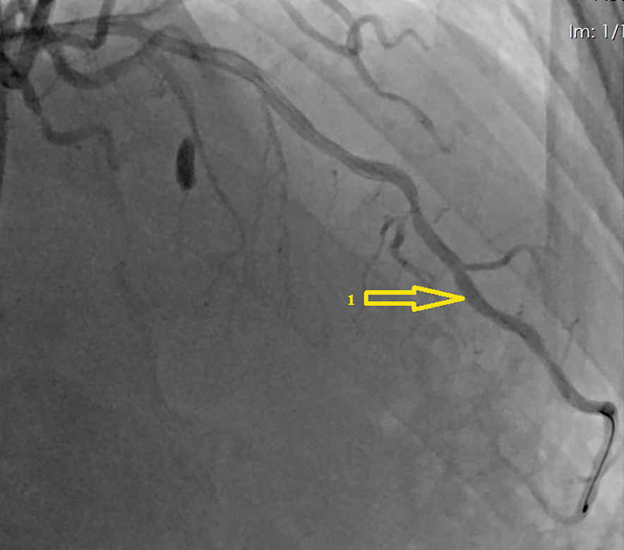Рис. 4. Коронарография: 1 — 90% стеноз передней нисходящей артерии. / Fig. 4. Coronary angiography: 1 — 90% stenosis of the left anterior descending artery.