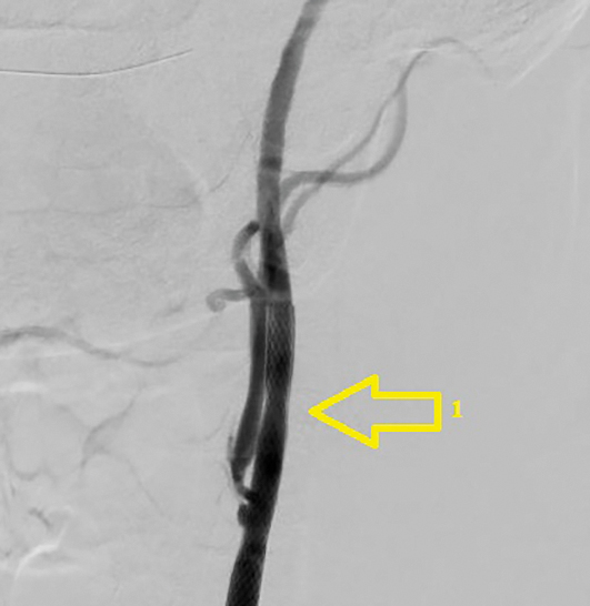 Рис. 6. Каротидная ангиопластика со стентированием левой ВСА: 1 — установленный стент. / Fig. 6. Carotid angioplasty with left ICA stenosis: 1 — installed stent.