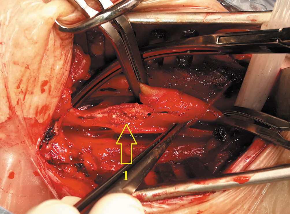 Рис. 7. Продольная артериотомия ВСА: 1 — выраженный кальциноз атеросклеротической бляшки в просвете ВСА. / Fig. 7. ICA longitudinal arteriotomy: 1 — significant calcification of the atherosclerotic plaque in the ICA lumen.