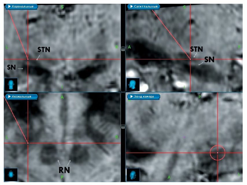 Всем пациентам была проведена предоперационная 3 Т МРТ в режимах T1 FSPGR BRAVO, T2 HIGH-RES, FLAIR и SWAN. Изображения совмещались на станции планирования «StealthStation S7» («Medtronic»). Расчётную точку цели (РТЦ) определяли по совокупности атлас-ориентированного, непрямого и прямого методов. На первом этапе расчёты проводили на основании стандартных координат (12 мм латерально, 2 мм кпереди и 4 мм книзу от середины межкомиссуральной линии). На втором этапе корректировали переднезаднюю координату относительно передней границы красного ядра. На третьем этапе координаты были скорректированы по результатам прямой визуализации СТЯ. Определялись верхняя и нижняя границы ядра, что позволило принять за РТЦ середину СТЯ (рисунок).