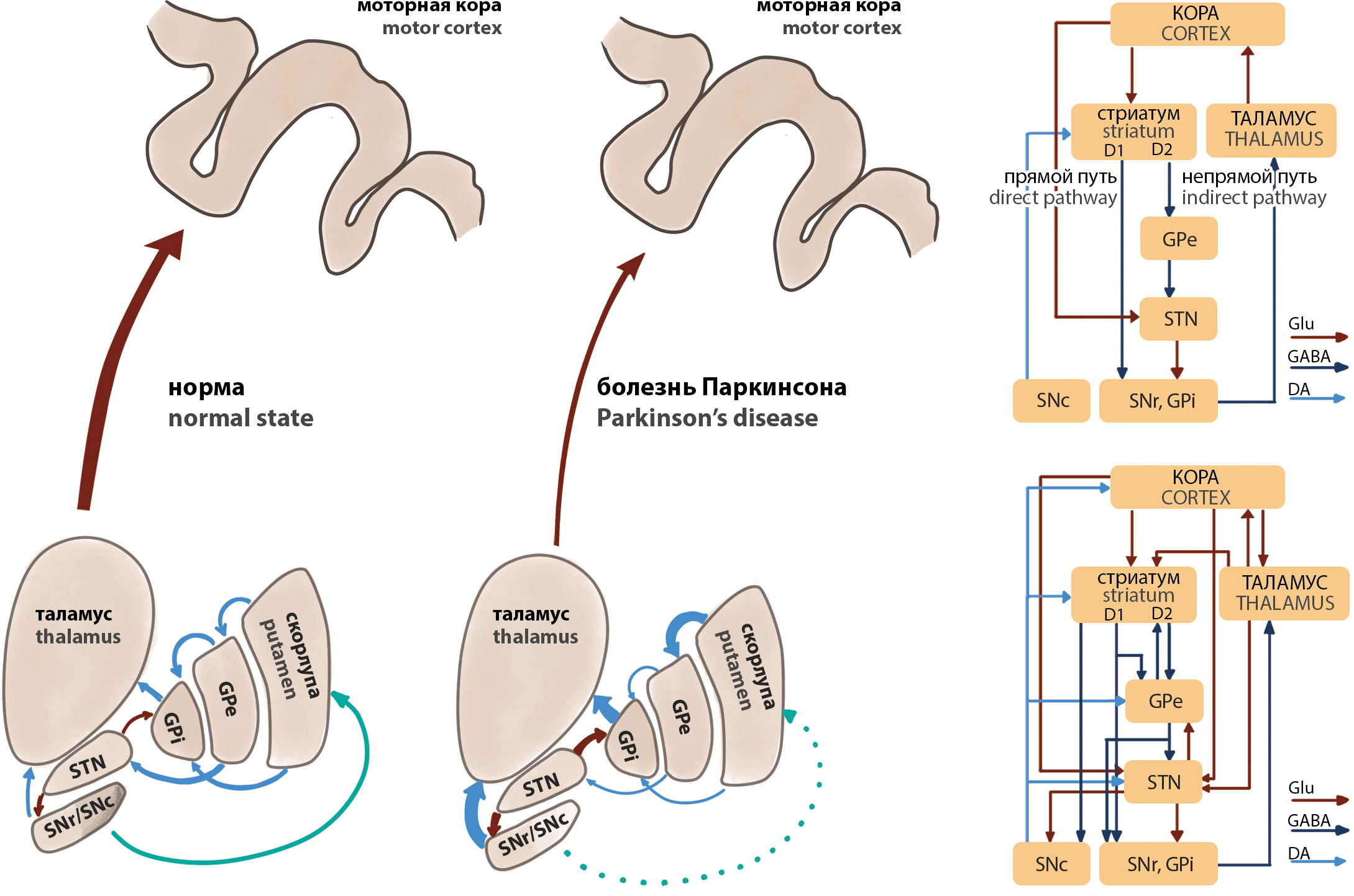 Основываясь на этой модели, было предложено объяснение для эффектов нейростимуляции на гипокинетические симптомы: подавление избыточной активности звеньев «непрямого» пути, которые затрудняют движение при БП [6]. Тем не менее некоторые данные не укладывались в рамки классической теории: например, стимуляция GPi приводит к облегчению как гипокинетических, так и гиперкинетических симптомов [7]. Таким образом, представления классической теории о функционировании БГ и эффектах нейростимуляции можно считать слишком упрощёнными.