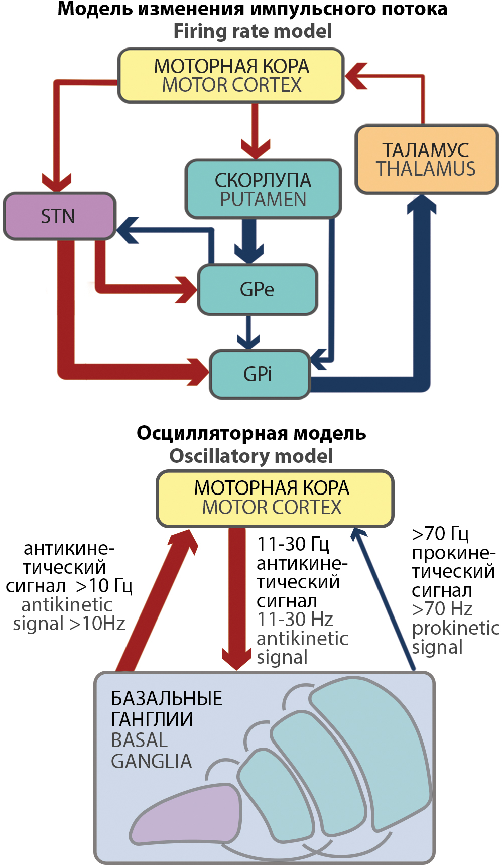 Впоследствии появились новые теории, которые опирались на ту же структурную основу сетевых проекций внутри БГ, однако развивали представления о функциональных процессах, происходящих внутри данной системы [7]. В этом случае патофизиология БП рассматривается как нарушение паттернов активности, необходимых для адекватного выполнения двигательных программ, а системный эффект DBS объясняется с позиций разрушения патологических паттернов, возникающих на фоне дофаминергического дефицита и нарушающих нормальную обработку двигательной информации в БГ [9] (рис. 2).