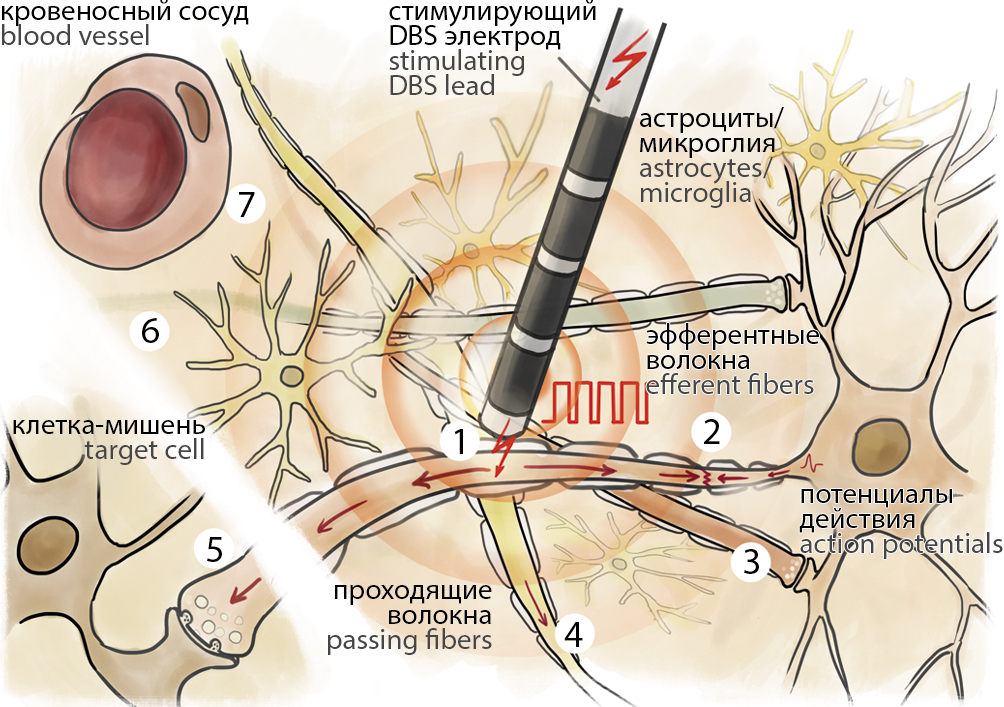 Локальные эффекты DBS могут опосредоваться не только через нейроны, но и через астроциты [41]. Электрическое поле может активировать эти глиальные клетки [42], вызывая выброс нейротрансмиттеров и нейромодуляторов (прежде всего, глутамата, аденозина и D-серина), которые воздействуют на пре- и постсинаптические рецепторы близлежащих нейронов. Такие воздействия влияют на работу синапсов и синаптическую пластичность и могут опосредовать долгосрочный терапевтический эффект DBS. Гистологические исследования обнаруживают вокруг имплантированных электродов умеренный глиоз — гипертрофию астроцитов и усиление продукции специфических для них белков, — даже спустя 12 лет после операции [43]. Таким образом, эффективность DBS опосредуется, вероятно, комплексными взаимодействиями между электрическим полем, сомой и аксонами нейронов и глиальными клетками.