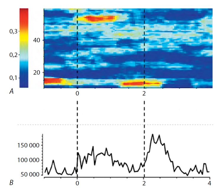 Рис. 4. Пример перистимульной спектрограммы записей локальных потенциалов STN пациента с БП. А — на спектрограмме заметны десинхронизация β-осцилляций (13–17 Гц) и синхронизация γ-осцилляций (60–70 Гц) при выполнении двигательных тестов. По оси абсцисс — время, с; по оси ординат — частота, Гц; цветом показана амплитуда спектральной мощности, %. В — ректифицированный сигнал электромиограммы мышц руки пациента (собственные данные). По оси абсцисс — время, с; по оси ординат — амплитуда, мкВ. Ширина стрелок отражает мощность передачи сигнала между структурами. / Fig. 4. Example of a peristimulus spectrogram of recordings of local potentials in the STN of a patient with PD. А — spectrogram showing desynchronization of β-oscillations (13–17 Hz) and synchronization of γ-oscillations (60–70 Hz) when performing motor tests. x axis is time, y axis is frequency, Hz, amplitude of the power spectrum is shown in colour, %. B — rectified EMG signal of the patient's arm muscle (own data). x axis is time, y axis is amplitude, μV.