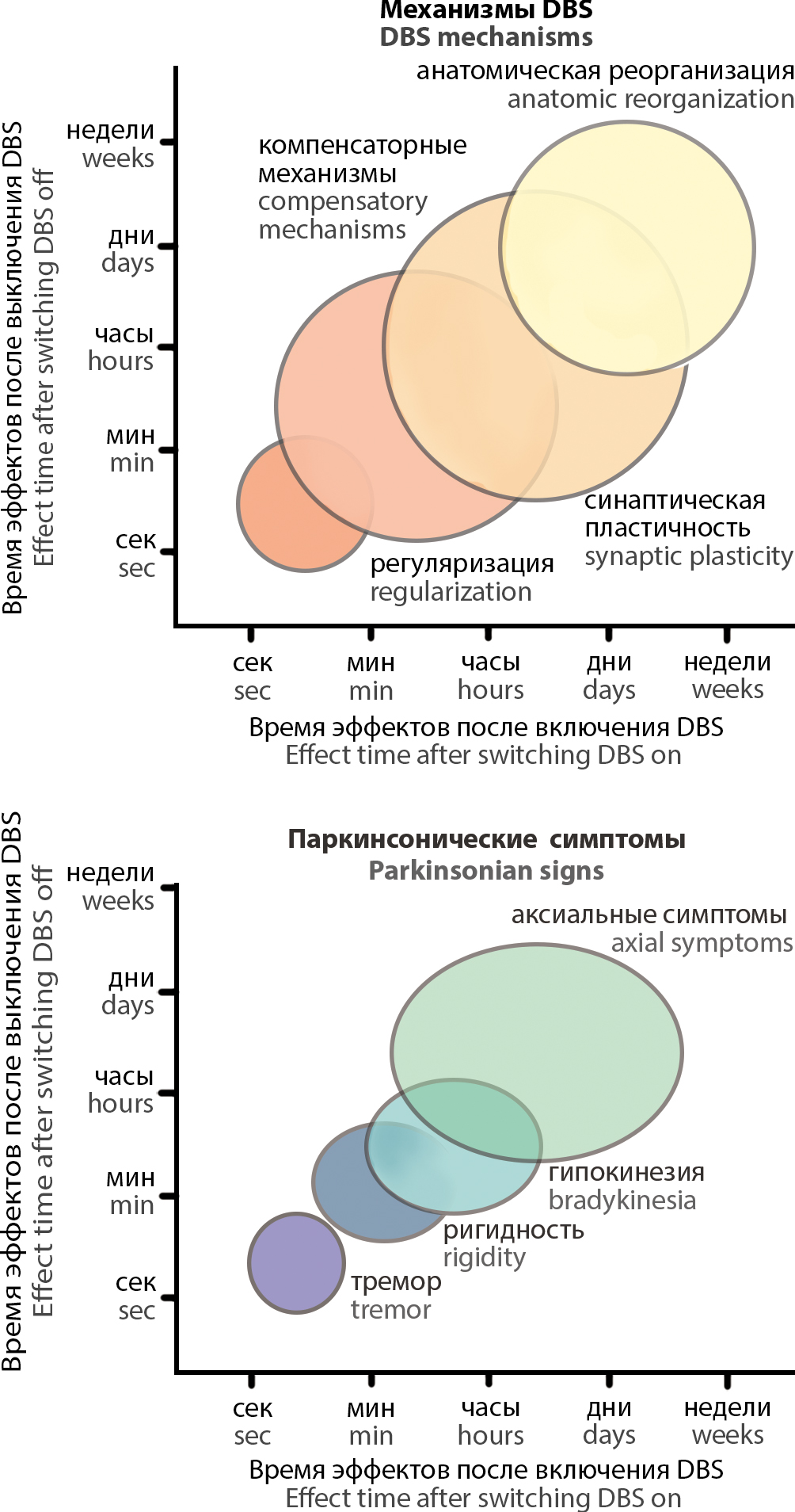 Особенность терапевтического действия DBS заключается в том, что эффекты в отношении различных симптомов БП проявляются в разные временные интервалы: выраженность тремора и ригидности, как правило, заметно ослабевает уже через несколько минут, а для облегчения брадикинезии требуется несколько часов или даже дней (рис. 5). Длительность стимуляции, необходимой для достижения терапевтического эффекта, зависит также от локализации электрода внутри той или иной структуры и параметров стимуляции [29].