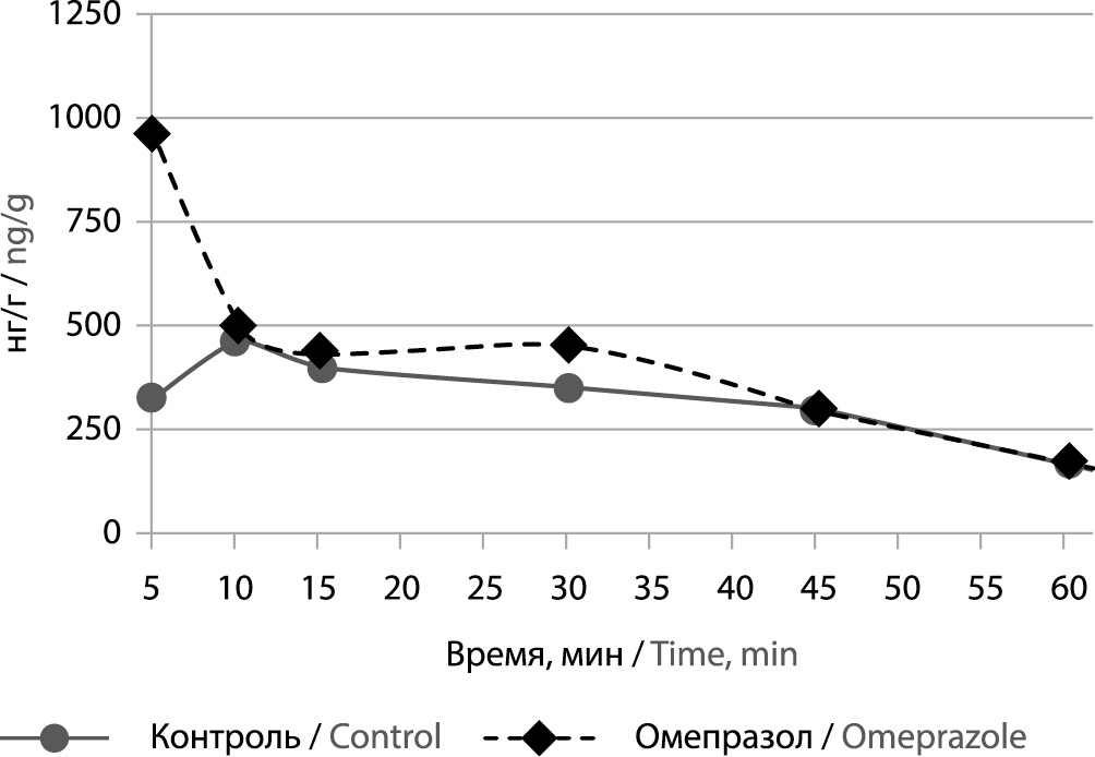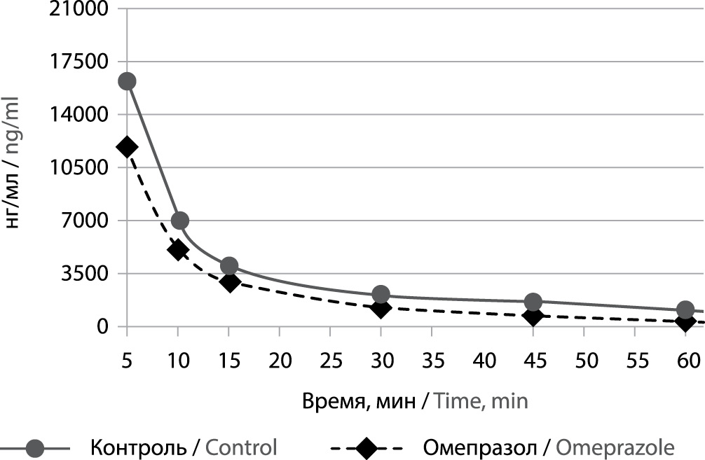Указанный показатель достоверно возрастал при применении ингибитора активности транспортёра — омепразола в 1,71 раза (p = 0,003).
