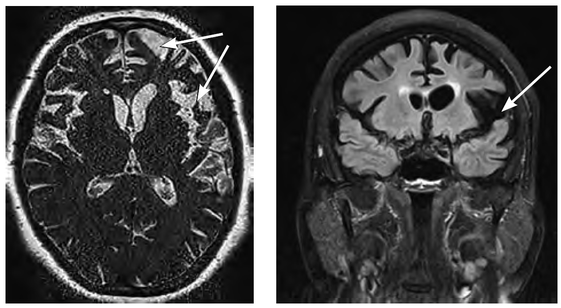 Характерным нейровизуализационным признаком являются атрофические изменения в области сильвиевой борозды доминантного полушария на корональном (или фронтальном) срезе в Т1-ВИ, при этом на других последовательных срезах выявление асимметричной атрофии вызывает затруднения даже у врачей-рентгенологов (рис. 2).