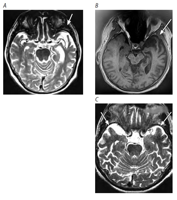 Рис. 3. МРТ головного мозга при сППА. Стрелки — атрофия (А, В — асимметричная, С — симметричная) передних отделов височной доли. / Fig. 3. Brain MRI of a patient with sPPA. Arrows indicate atrophy (А, В — asymmetrical, С — symmetrical) of the anterior temporal lobe.