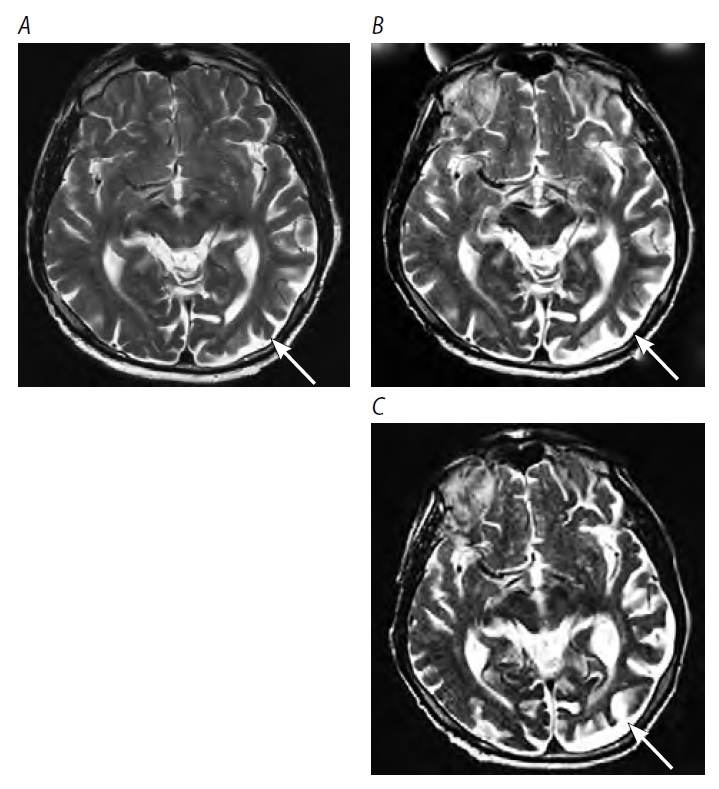 Рис. 4. МРТ головного мозга пациента с лППА в динамике: при первичном обращении (А), через 2 года наблюдения (В), через 3 года наблюдения (С). Выраженная асимметричная атрофия головного мозга с преимущественным вовлечением левой височной доли, затылочной доли. / Fig. 4. Brain MRI of a patient with lPPA over time: initial presentation (A), after 2 years of follow-up (B), after 3 years of follow-up (C). Significant asymmetrical brain atrophy, predominantly in the left temporal lobe and occipital lobe.