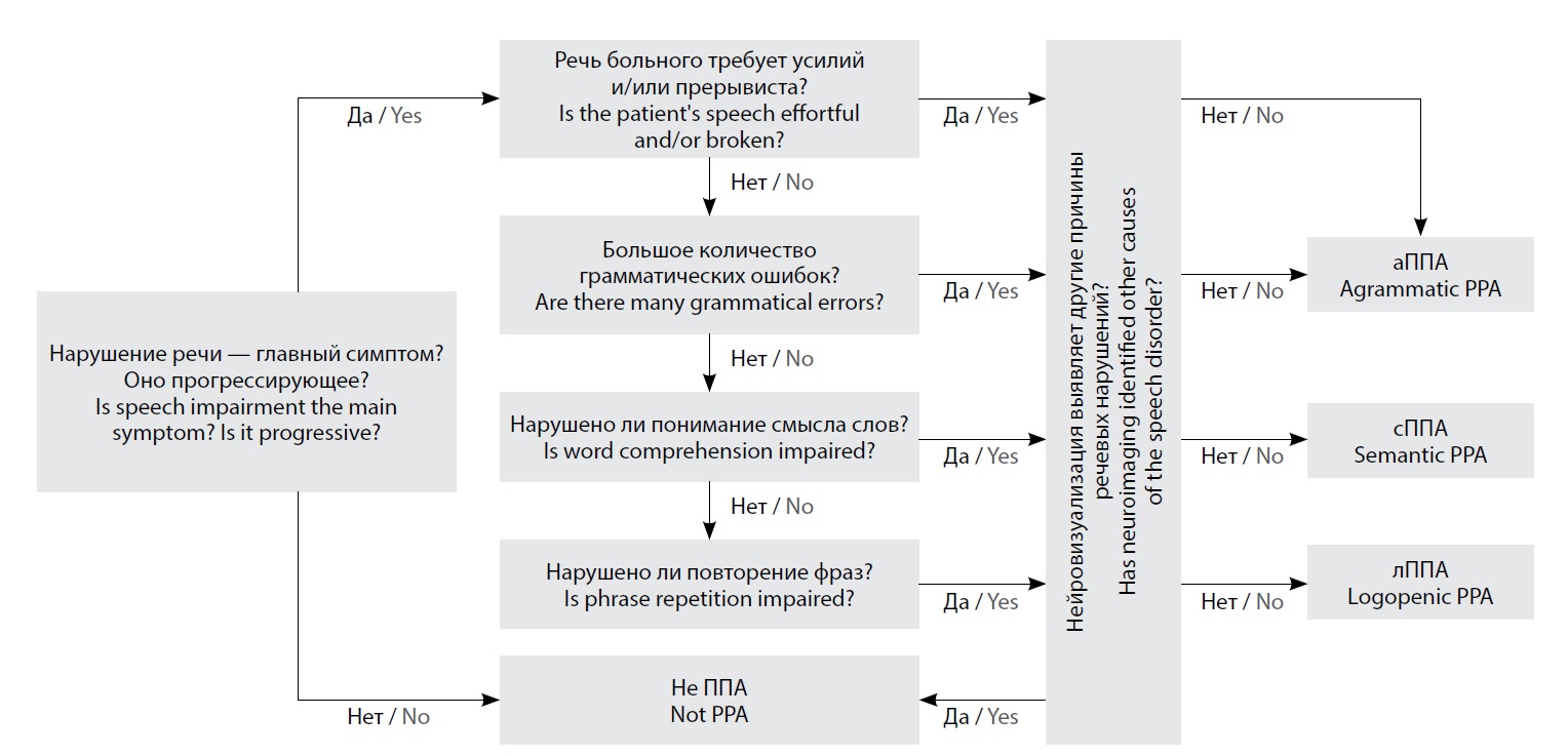 С учётом того, что афатические нарушения являются доминирующим признаком среди других когнитивных расстройств, выявление сфер нарушений речи позволяет упростить дифференциальную диагностику форм ППА, а также выбрать наиболее подходящую логопедическую и когнитивную реабилитацию. На рис. 5 представлен алгоритм диагностики вариантов ППА по речевым нарушениям.