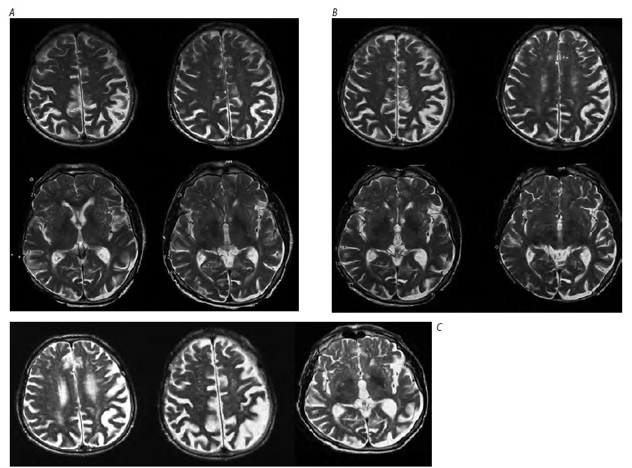 Рис. 6. МРТ-изображения головного мозга пациента со смешанной формой ППА с последующим развитием клинически значимого кортико-базального синдрома. А — МРТ головного мозга 2016 г.; В — 2017 г.; С — 2019 г. / Fig. 6. Brain MRI of a patient with mixed PPA and subsequent development of clinically significant corticobasal syndrome. А — brain MRI in 2016; В — in 2017; С — in 2019.
