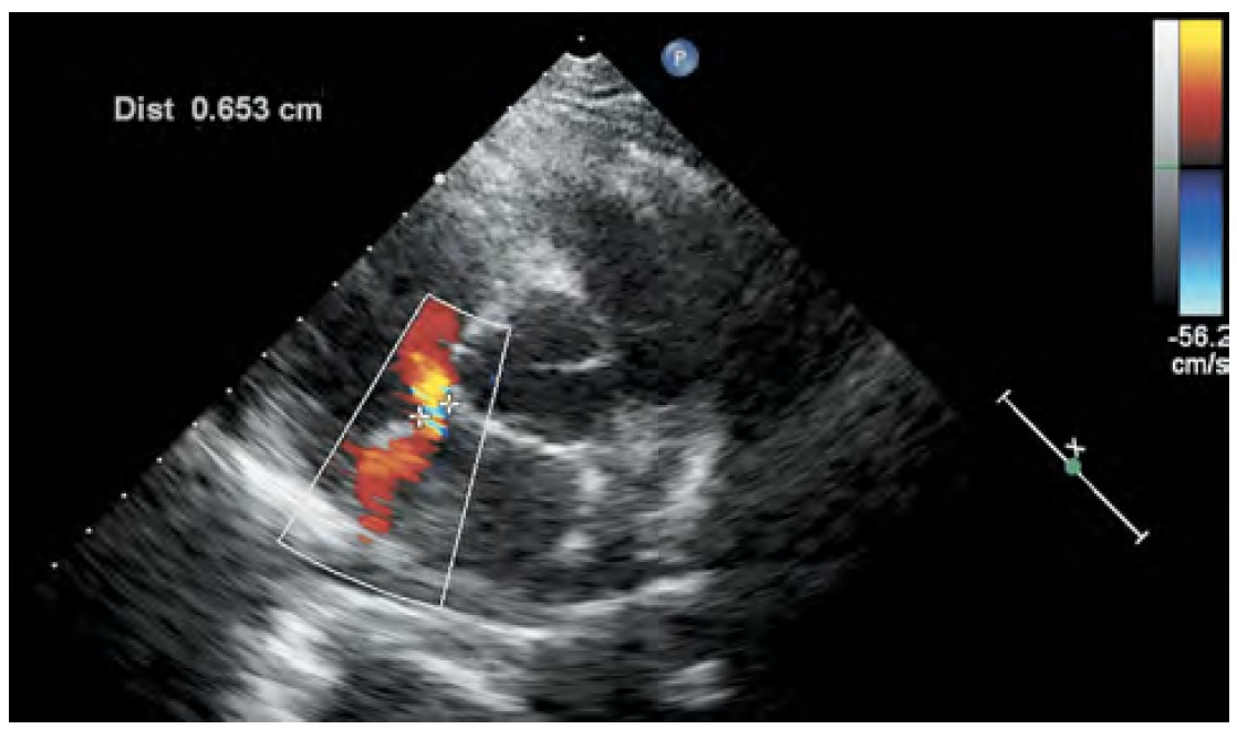 Рис. 1. Трансторакальная эхокардиография. Парастернальная позиция по короткой оси аорты. При цветовой допплерографии в межпредсердной перегородке визуализируется вторичный ДМПП со сбросом крови слева- направо максимальным размером до 6,5 мм. / Fig. 1. Transthoracic echocardiography. Parasternal short-axis view. Colour Doppler ultrasound of the atrial septum reveals a secondary ASD with a right-to-left blood shunt and a maximum size of 6.5 mm.