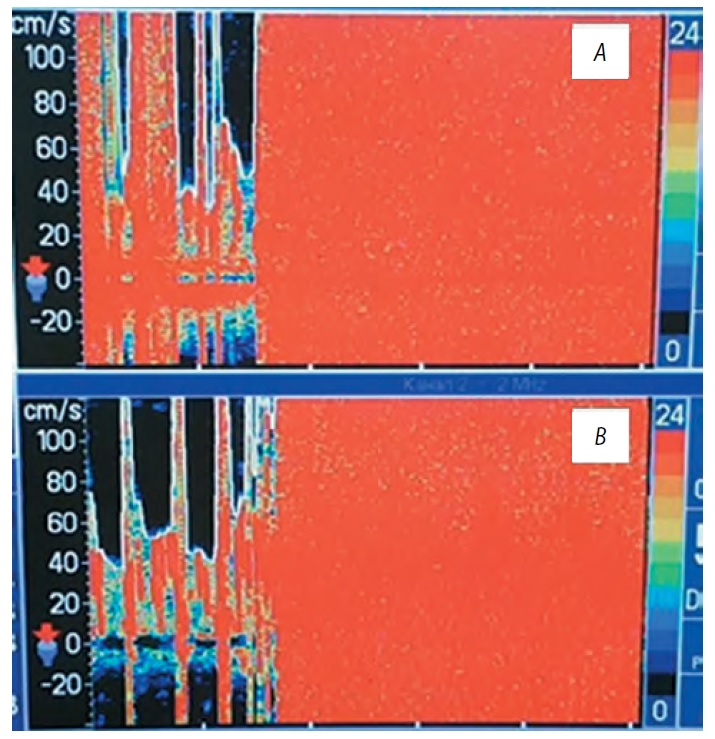 Рис. 2. Билатеральный ТКД-мониторинг с введением контрастного вещества в покое. Запись спектра кровотока по правой (А) и левой (В) средним мозговым артериям. В левой части снимков определяются отдельно расположенные МЭС (красного цвета), которые в правой части сливаются, приводя к эффекту «занавеса». / Fig. 2. Bilateral transcranial Doppler ultrasound monitoring with contrast enhancement at rest. Recording of the right (А) and left (В) middle cerebral artery blood flow. The images on the left show separate microembolic signals (red), which merge on the right to create a "curtain" effect.