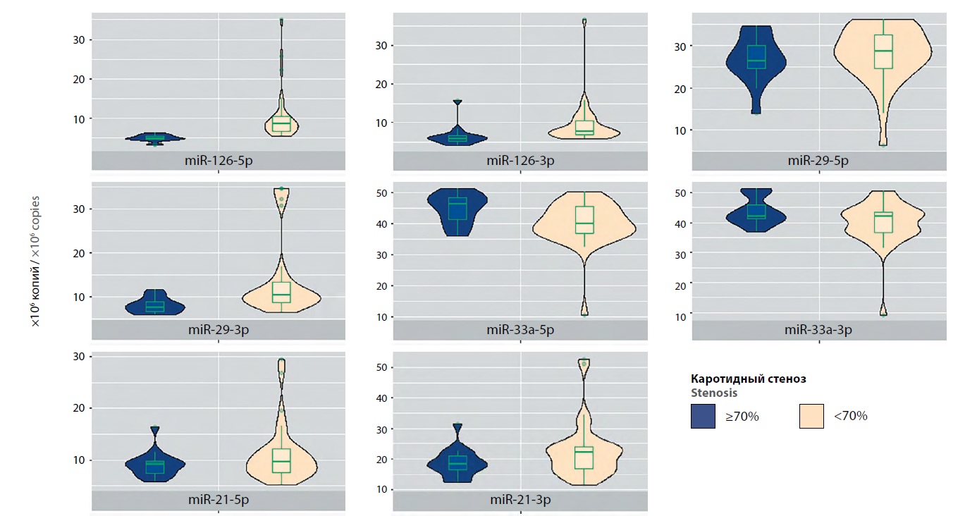 В проведённом нами пилотном исследовании на небольшой когорте пациентов с проявлениями хронической ЦВП были продемонстрированы различия в экспрессии miR-126-5p, miR-126-3p, miR-29-5p, miR-29-3p, miR-33a-5p, miR-33a-3p, miR-21-5p, miR-21-3p в зависимости от наличия у них каротидного атеросклероза [7].