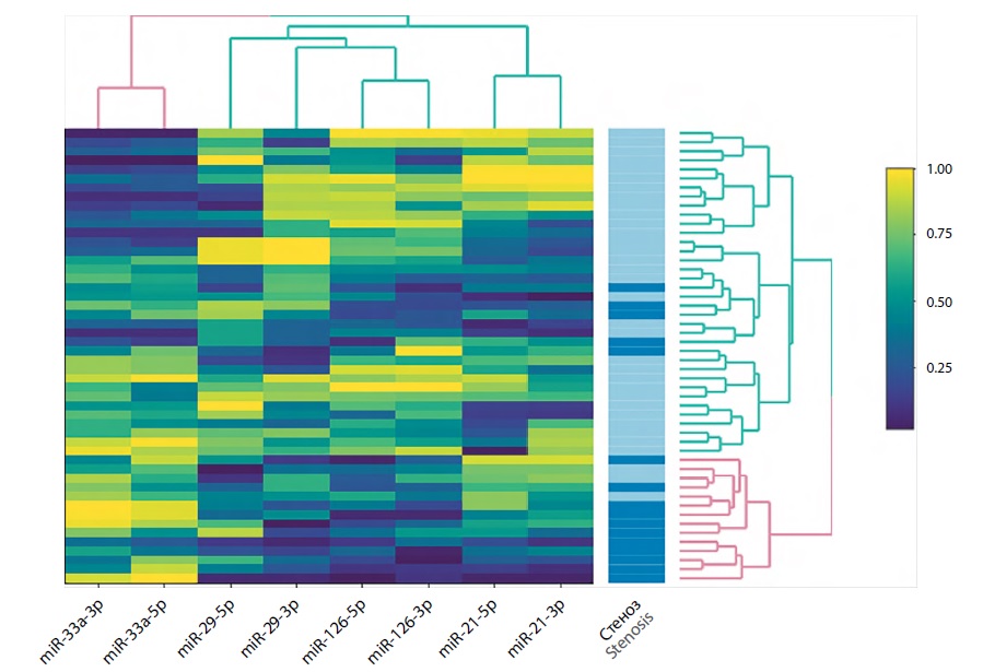 Статистическая обработка данных проводилась с использованием языка программирования R (версия 4.1.0) в программной оболочке «RStudio v.1.4.1717» и загружаемых модулей «tidyverse», «reshape2», «heatmaply», «ggstatsplot», «ggcorrplot». Непрерывные случайные величины представлены в виде: медиана [нижний квартиль; верхний квартиль], категориальные — как частота (%). Две независимые группы сравнивали с использованием критерия Вилкоксона–Манна–Уитни, пропорции в двух выборках — с помощью z-статистики Пирсона. С целью визуального представления относительного уровня экспрессии исследованных микроРНК использована «тепловая карта», где каждая строка соответствует одному наблюдению. Трансформация данных проведена с помощью функции «percentize», заключавшейся в применении эмпирической (выборочной) функции распределения к каждому значению переменных: таким образом, цвет ячейки указывает на значение перцентиля (то есть долю пациентов со значением экспрессии таким же или меньше). В использованной цветовой палитре «viridis» значения, близкие к 1, принимали жёлтый цвет, а близкие к 0 — тёмно-синий. Иерархическая кластеризация проведена с использованием алгоритма «optimal leaf ordering», визуализирована с помощью дендрограмм. Столбец «Стеноз» отражает оригинальное деление на группы, более тёмный цвет соответствует наличию у пациента стеноза ВСА 70% и более. Корреляционный анализ проводился непараметрическим методом с вычислением коэффициента Спирмена (ρ). Пороговый уровень двусторонней статистической значимости был выбран равным 0,05.