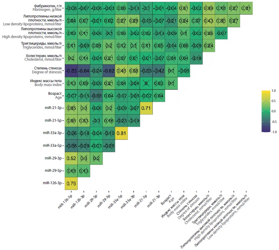 Результаты. У пациентов с КА высоких градаций по сравнению с группой сравнения была снижена экcпрессия miR-126-5p/-3p (4,8 и 5,9 vs. 8,5 и 7,6 соответственно; p < 0,001), miR-29-3p (7,6 vs. 10,3; p < 0,001) и повышена — miR-33a-5p (46,3 vs. 40,0; p < 0,05). Кластерный анализ подтвердил характерные паттерны экспрессии указанных микроРНК у пациентов с разной степенью поражения ВСА. Также определены значимые отрицательные корреляции между степенью стеноза и экспрессией miR-126-5p (ρ = –0,83; р < 0,05), miR-126-3p (ρ = –0,64; р < 0,05) и miR-29-3p (ρ = –0,62; р < 0,05).