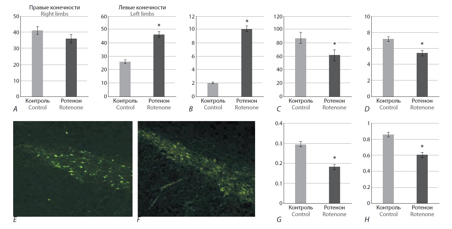 Описанная в настоящей работе модель паркинсонизма с длительным введением крысам ротенона в малых дозах позволяет воспроизвести основные нарушения, характерные для БП: моторный дефицит и дегенерацию нейронов в чёрном веществе головного мозга. У экспериментальных животных выявлено нарушение координации движений, выражающееся в более частом, по сравнению с контролем, оступании левыми конечностями. Латерализация моторных симптомов характерна для пациентов на ранних стадиях БП, при этом по мере прогрессирования заболевания она может становиться менее выраженной [14]. Двигательная асимметрия имеет большую клиническую значимость для дифференциальной диагностики БП и других сходных паркинсонических синдромов. Вместе с тем общая двигательная активность, определяемая путём измерения средней дистанции пробега в тесте «открытое поле», не была снижена. Не выявлено и других симптомов, характерных для развернутой стадии БП (ригидность, характерная сгорбленная поза, снижение массы тела) и наблюдаемых обычно на «острых» моделях с введением больших доз нейротоксинов [15]. Таким образом, описанная в нашей работе модель воспроизводит начальную стадию БП.
