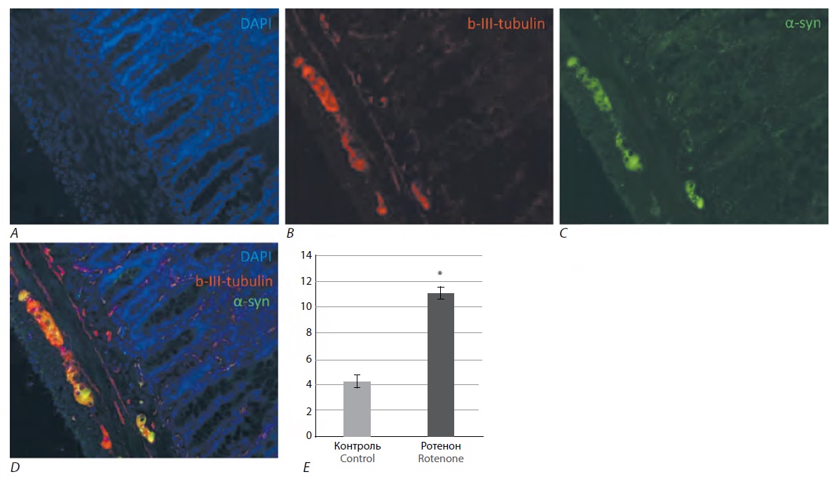 Рис. 2. Общий α-синуклеин (α-syn) в нервной системе кишечника крыс при длительном введении ротенона. A–D — локализация общего α-синуклеина в β-III-тубулин-позитивных структурах нервной системы кишечника крысы опытной группы, × 20; А — иммунофлюоресцентное окрашивание на ядра клеток (DAPI, синий); В — иммунофлюоресцентное окрашивание на β-III-тубулин (красный); C — иммунофлюоресцентное окрашивание на общий α-синуклеин (красный); D — результат наложения изображений А–С. Области колокализации маркеров β-III-тубулина и общего α-синуклеина — жёлтый, оранжевый; E — интенсивность иммунофлюоресцентного окрашивания на общий α-синуклеин в ганглиях межмышечного сплетения, усл. ед. *р < 0,05. / Fig. 2. Total alpha-synuclein (α-syn) in the enteric nervous system of rats after long-term administration of rotenone. A–D — the location of total α-synuclein in the β-III-tubulin positive structures of the enteric nervous system in an experimental animal, × 20; А — immunofluorescence staining of cell nuclei (DAPI, blue); В — immunofluorescence staining of β-III-tubulin (red); C — immunofluorescence staining of total α-synuclein (red); D — the result of overlaying images А–С. Areas of β-III-tubulin and total α-synuclein colocalization are yellow and orange. E — intensity of immunofluorescence staining of total α-synuclein in the Auerbach's plexus ganglion cells, C.U. *р < 0.05.