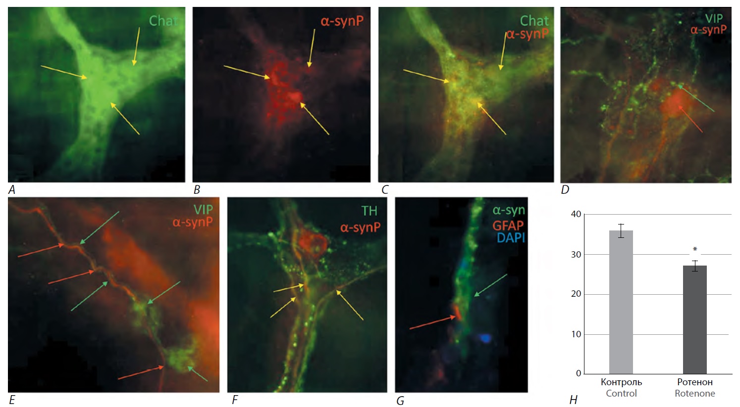 Для уточнения накопления и локализации фосфорилированной формы белка, ассоциированного с развитием БП, дополнительно на тотальных препаратах проведено двойное иммуномечение на фосфо-α-синуклеин и маркеры основных популяций миентеральных нейронов — возбуждающих и тормозных. Фосфорилированный α-синуклеин был выявлен в возбуждающих (Chat-позитивных), но не в тормозных (VIP-позитивных) элементах энтеральной нервной системы. Это указывает на уязвимость холинергических структур при развитии патологического процесса, связанного с повышением экспрессии, модификацией, агрегацией и распространением α-синуклеина, и, возможно, их поражение приводит к нарушению моторики тонкой кишки и замедлению кишечного транзита, наблюдаемого на данной ротеноновой модели.