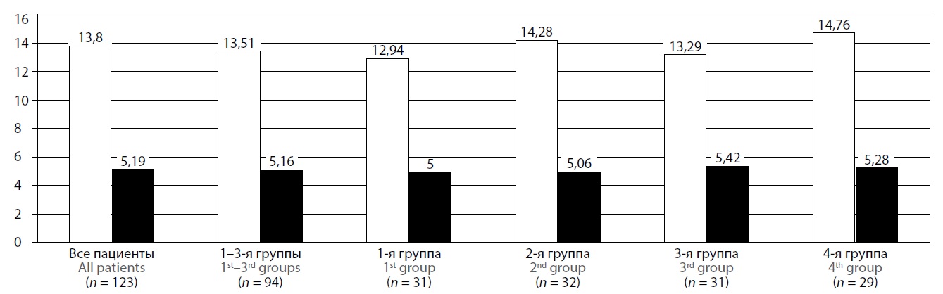 После МР After medical rehabilitation | 4 | 8 | 6,00 ± 0,30 | 1,60 |