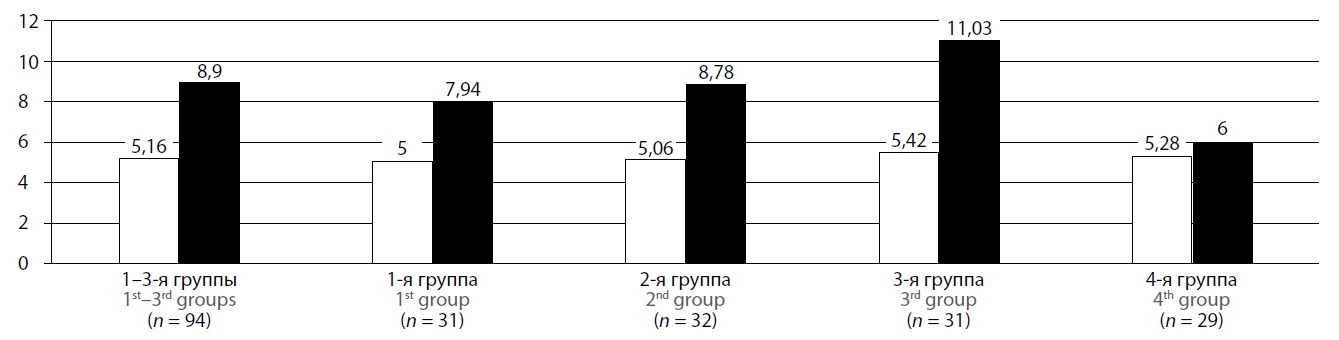 На рис. 2 представлены данные сравнения ПМР по оценочной таблице ПМР пациентов до и после МР. На графике отчётливо прослеживается меньшая степень дефицитарности детей 3-й группы и усугубившиеся на фоне положительной динамики в 1–3-й группах показатели ПМР детей 4-й группы.