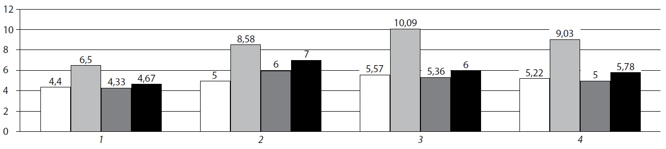Рис. 3. ПМР пациентов по оценочной таблице ПМР (мес) с различной локализацией очага эпилептической активности и её распространённостью по конвекситальным проекциям до и после МР. 1 — в 1–3-й группах до МР; 2 — в 1–3-й группах после МР; 3 — в 4-й группе до МР; 4 — в 4-й группе после МР. / Fig. 3. Patient psychomotor development according to the scale of psychomotor development (months) with different locations of the epileptic focus and its distribution along the convex surface, before and after medical rehabilitation. 1 — in groups 1–3 before medical rehabilitation; 2 — in groups 1–3 after medical rehabilitation; 3 — in group 4 before medical rehabilitation; 4 — in group 4 after medical rehabilitation.
