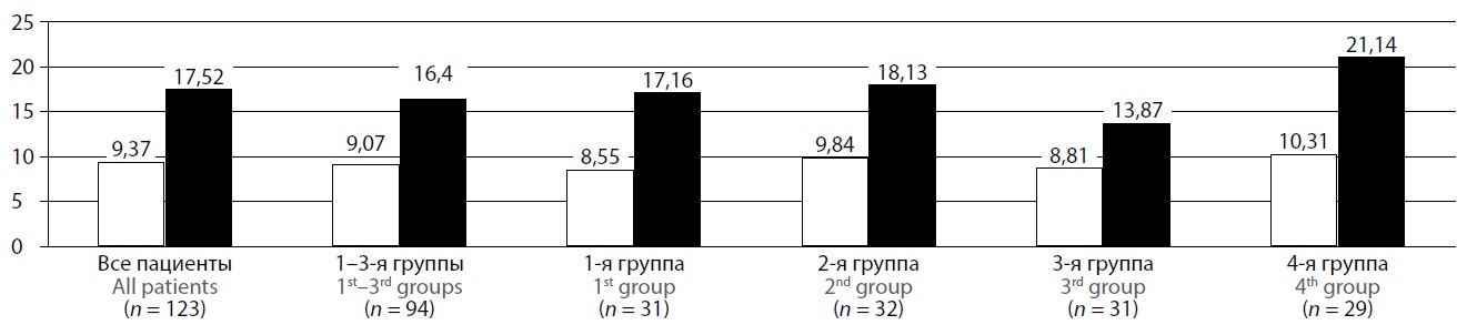 Рис. 2. Возраст по оценочной таблице ПМР до (светлые столбики) и после (тёмные столбики) курса МР у пациентов исследованных групп. / Fig. 2. Patient age according to the scale of psychomotor development before (light columns) and after (dark columns) the medical rehabilitation in the study groups.