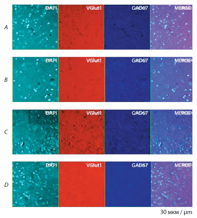 Рис. 1. Экспрессия VGlut1 и GAD67 на клетках ПК животных (Р60) в группе контроля (А), экспериментальных группах через 2 ч (В), 24 ч (С) и 7 дней (D) после ОС. / Fig. 1. VGlut1 and GAD67 expression on the piriform cortex cells of animals (Р60) in the control group (А) and experimental groups, 2 hours (В), 24 hours (С) and 7 days (D) after OS.