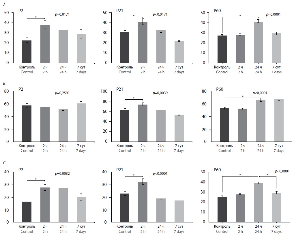 Рис. 2. Количество клеток (в %), экспрессирующих VGlut1 (А), GAD67 (В) и коэкспрессирующих GAD67 и VGlut1 (С) в ПК животных в группе контроля, экспериментальных группах через 2 ч, 24 ч и 7 дней после ОС. В каждой группе 5 животных, от каждого животного 5 срезов, 5 полей зрения. В выборке 25 образцов. *р < 0,01 (однофакторный ANOVA с последующим post-hoc тестом Бонферрони). / Fig. 2. Number of cells (%) expressing VGlut1 (А), GAD67 (В) and coexpressing GAD67 and VGlut1 (С) in the piriform cortex of animals in the control and experimental groups, 2 hours, 24 hours and 7 days after OS. Five animals, 5 sections from each animal, 5 fields of view in each group. The sample contained 25 specimens. *р < 0.01 (one-way ANOVA with a subsequent post-hoc Bonferroni test).