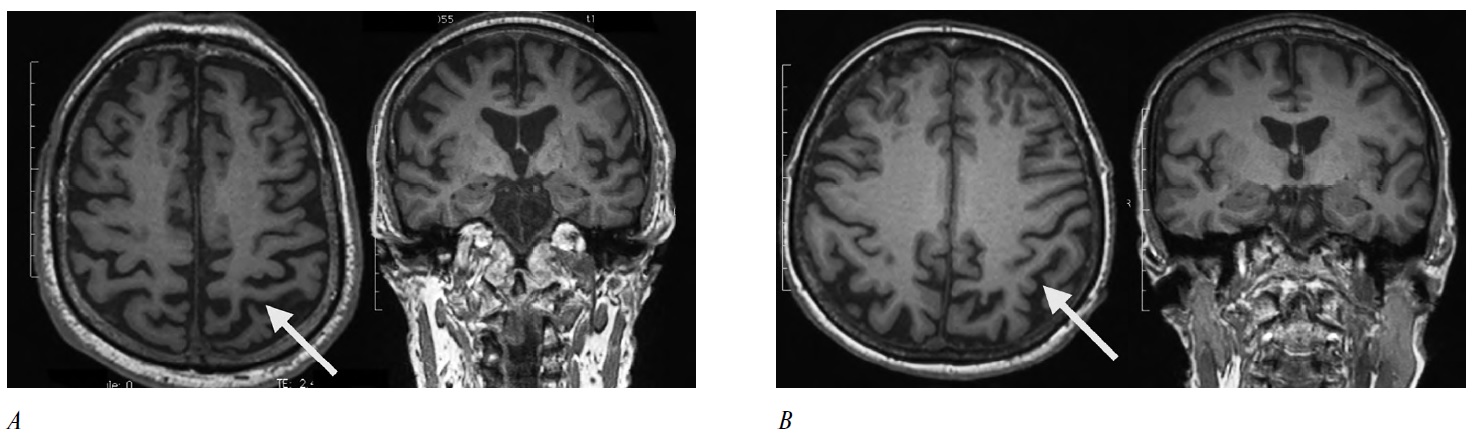 Рис. 1. МРТ головного мозга пациентов с фенотипом КБС при нормальном соотношении биомаркеров (А) и изменённых биомаркерах (уровень бета-амилоида 1–42 и тау-белка в ЦСЖ — В). Стрелками указаны зоны гипотрофии в теменной области слева (контралатерально клиническим проявлениями) при сохранной области гиппокампа в обоих случаях. / Fig. 1. Brain MRI of patients with the CBS phenotype, the normal ratio (A) and altered biomarkers (β-amyloid 1–42 and tau protein in the CSF — B). Arrows indicate areas of hypotrophy in the left temporal lobe (contralateral to the clinical symptoms), with preserved hippocampus in both cases.