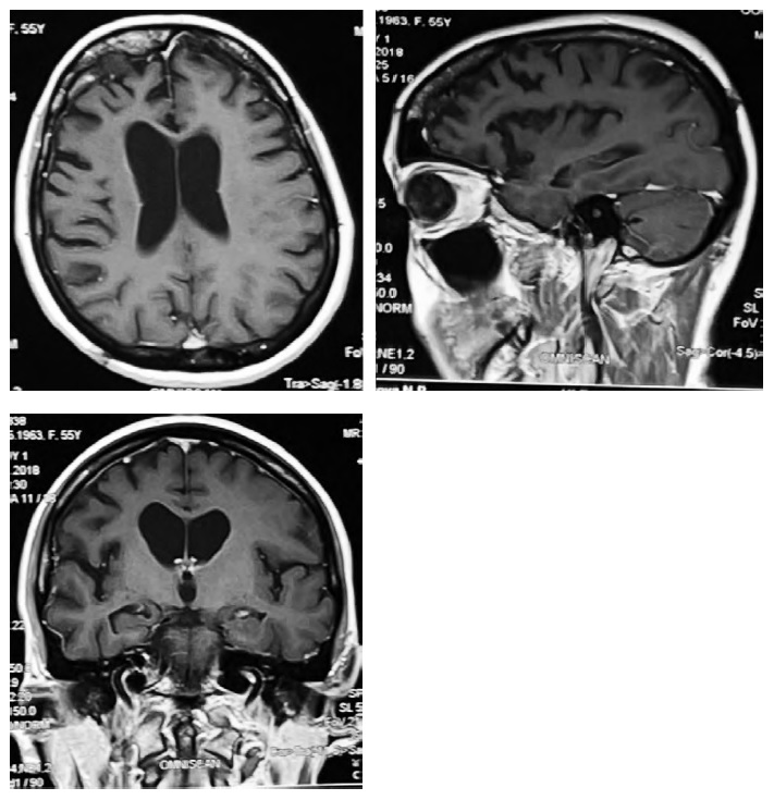 Рис. 2. МРТ головного мозга пациентки с фенотипом КБС в рамках поведенческого варианта ЛВД с выявленной мутацией в гене GRN / Fig. 2. Brain MRI of patient with CBS phenotype as part of behavioral variant of frontotemporal dementia with a mutation in the GRN gene