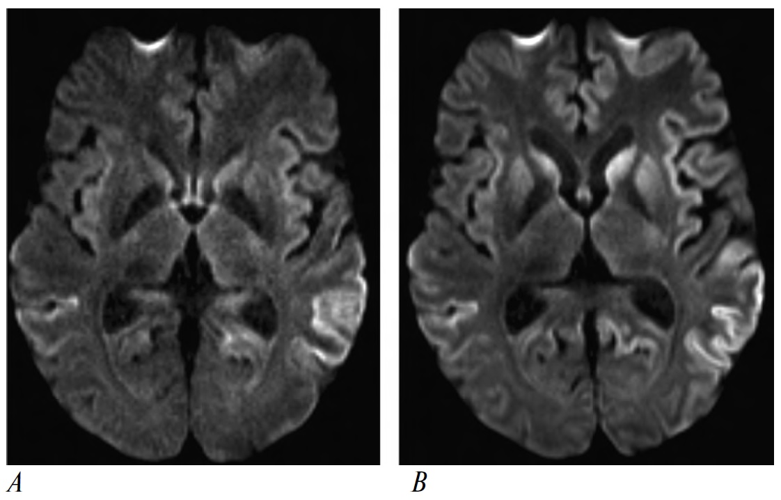 Рис. 3. МРТ головного мозга (режим ДВИ) пациентки с БКЯ при наличии КБС через 10 (А) и 12 мес (В) после дебюта заболевания. / Fig. 3. Brain MRI (DWI mode) of patient with CJD, presenting with CBS, 10 (A) and 12 (B) months after disease onset.