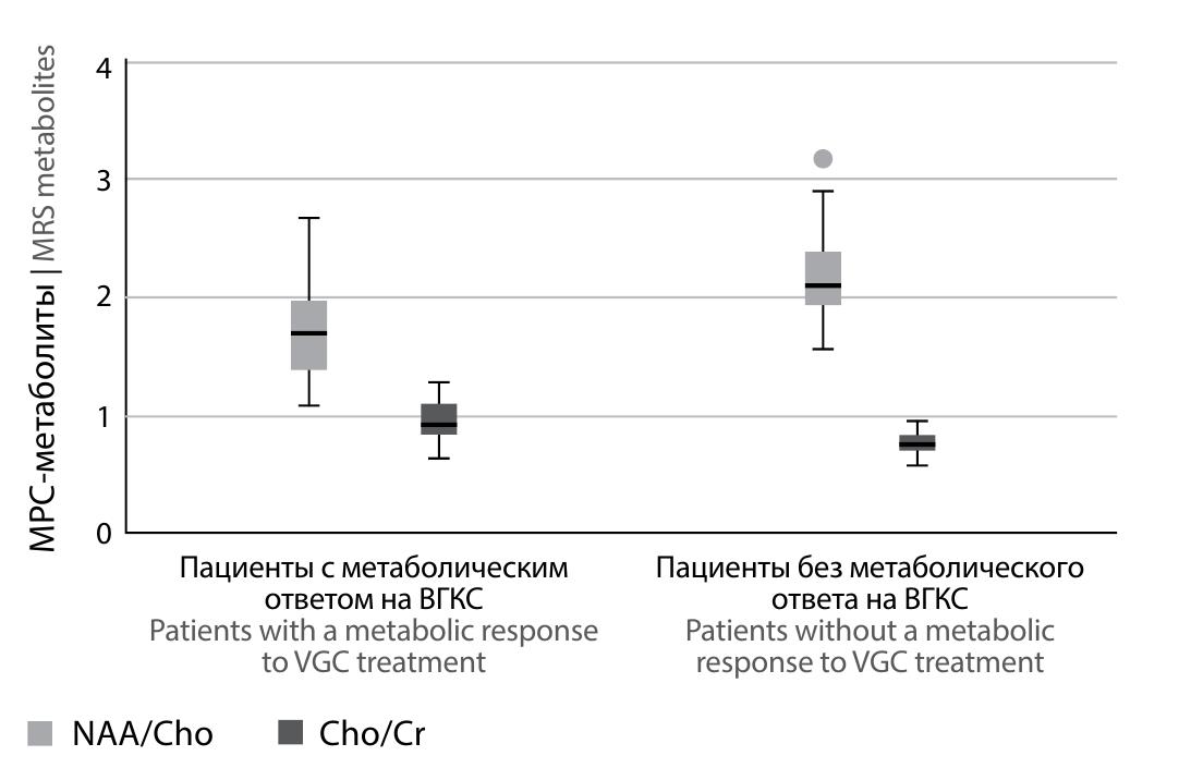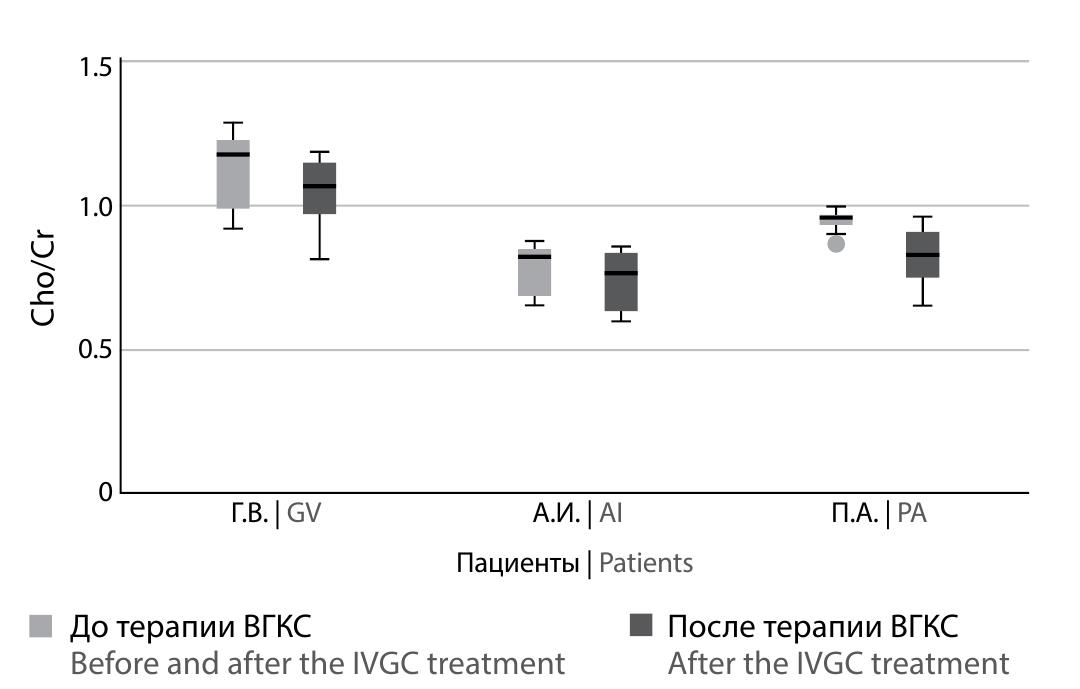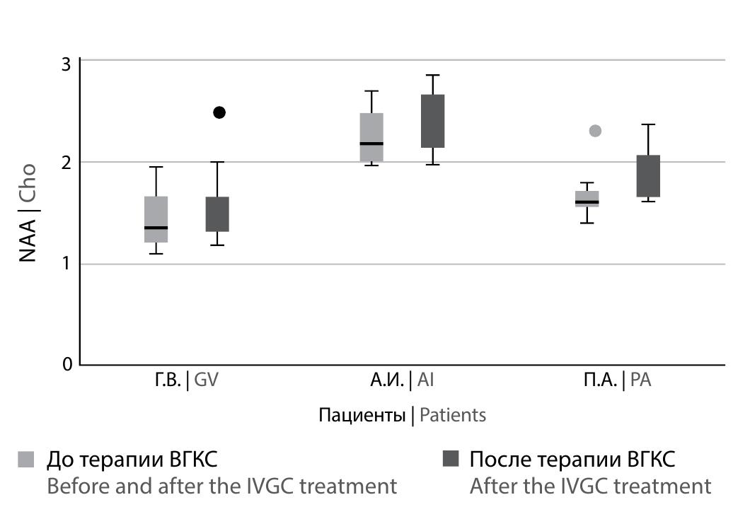 В нашем исследовании показано диффузное изменение относительных концентраций метаболитов, оценённых с помощью мультивоксельной МРС в сером (NAA/Cho и Cho/Cr) и белом (Cho/Cr) веществе ГМ, данные показатели статистически различались внутри исследуемой группы пациентов. Примерно у трети пациентов после терапии ВГКС наблюдалось значительное восстановление соотношения NAA/Cho и снижение Cho/Cr в области поясных извилин, а у одного из них — снижение соотношения Cho/Cr в белом веществе перивентрикулярного среза.