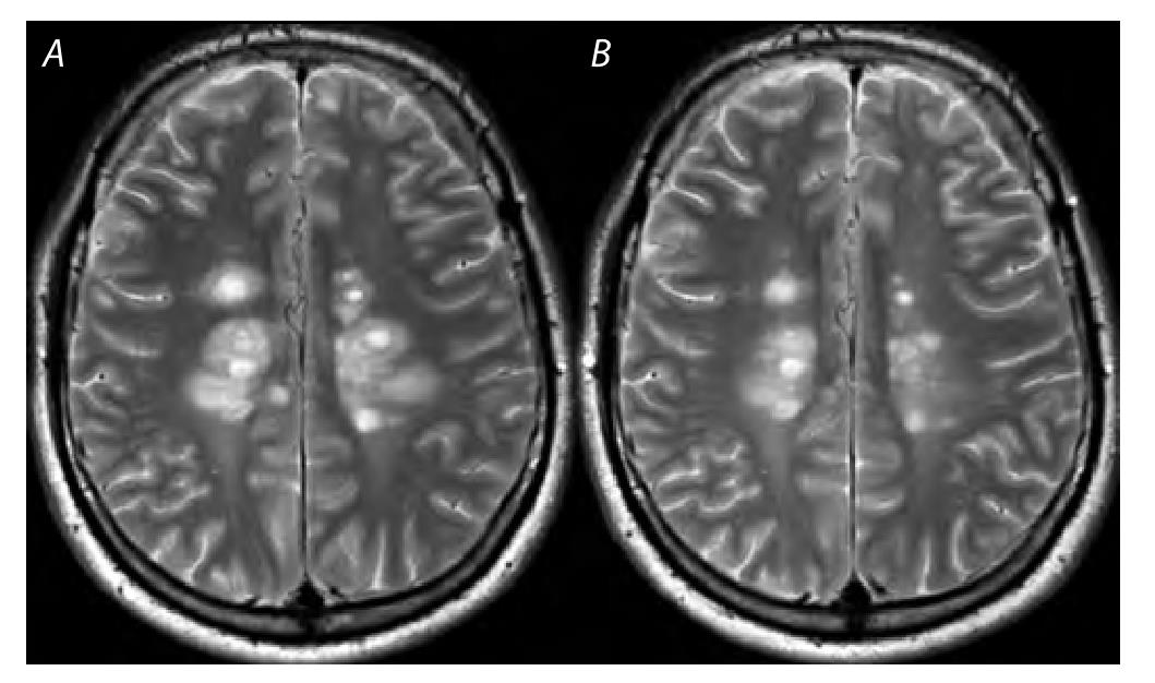 A — до терапии ВГКС: T2WI, множественные очаги демиелинизирующей природы с выраженным перифокальным отёком в белом веществе лобных и теменных долей; B — после терапии ВГКС: выраженный регресс нескольких ранее обнаруженных патологических очагов.