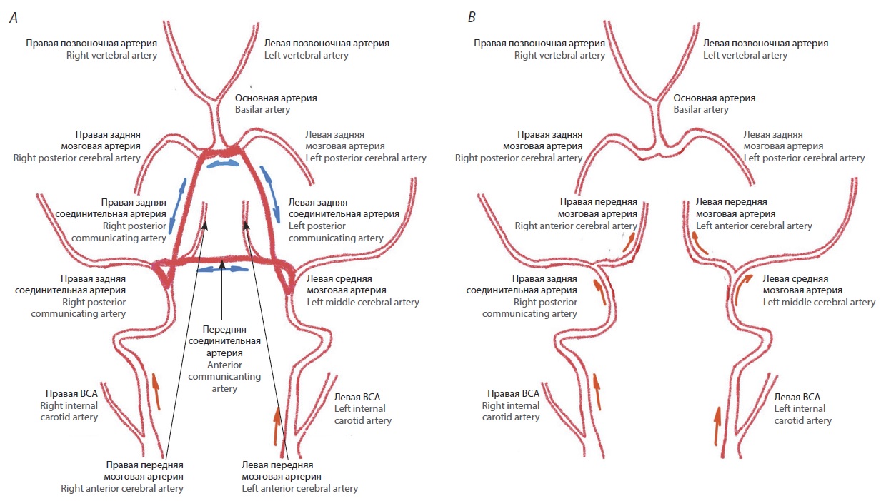 Рис. 2. Схема Виллизиева круга головного мозга пациента М. А — тип О (полностью замкнутый Виллизиев круг, синими стрелками обозначен кровоток по кругу Вилленса — возможность реверсивного артериального кровотока при стенозе или окклюзии экстракраниальных артерий), встречаемость в популяции — 11,9%; В — тип Ас2Рс (полностью разомкнутый Виллизиев круг, нет возможности компенсации кровотока при поражении экстракраниальных артерий), встречаемость в популяции — 9,3%. / Fig. 2. The schematic view of the patient M.' circle of Willis. А — type O (fully closed CoW, with blue arrows indicating blood flow in the Circle of Willis — possible reverse arterial blood flow if extracranial arteries are stenosed or occluded), incidence 11.9%); В — type Ас2Рс (fully open CoW, with uncompensatable blood flow if extracranial arteries are involved), incidence 9.3%.