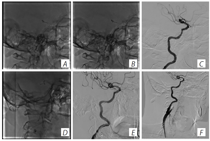 Рис. 5. Реваскуляризация СА пациента М. А — проводник расположен в средней мозговой артерии; В — ангиопластика ВСА в С4 сегменте; С — ВСА после баллонной ангиопластики С4 сегмента; D — позиционирование стента в зоне остаточного стеноза ВСА; Е — ВСА после стентирования С4 сегмента; F — стентирование ВСА в С1 сегменте. / Fig. 5. Transcarotid artery revascularization in patient M. А — guidewire positioning in MCA; В — ICA C4 angioplasty; С — ICA post C4 angioplasty; D — stent positioning in the area of ICA residual stenosis; Е — ICA post C4 stenting; F — С1 ICA stenting.